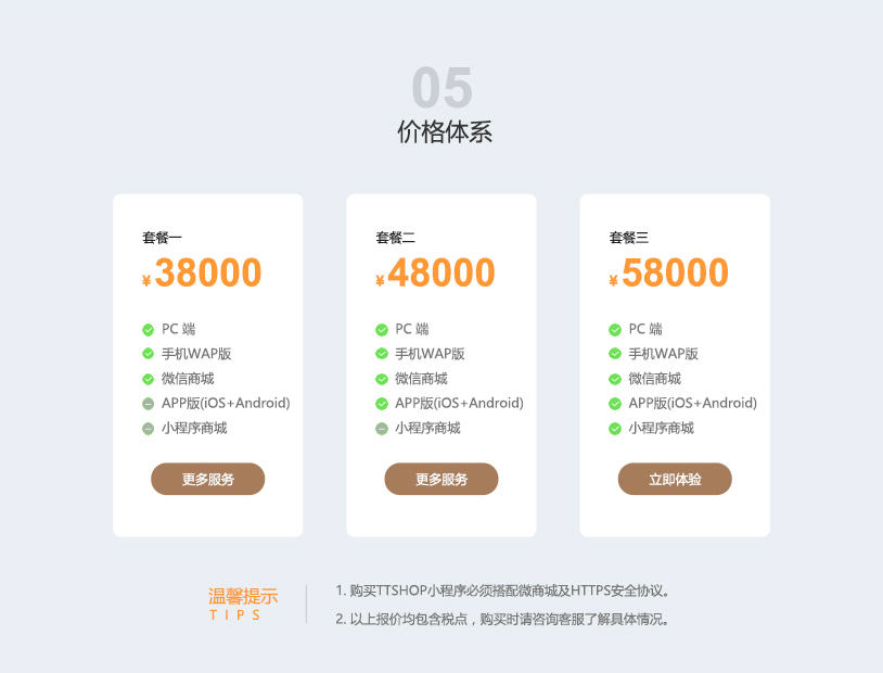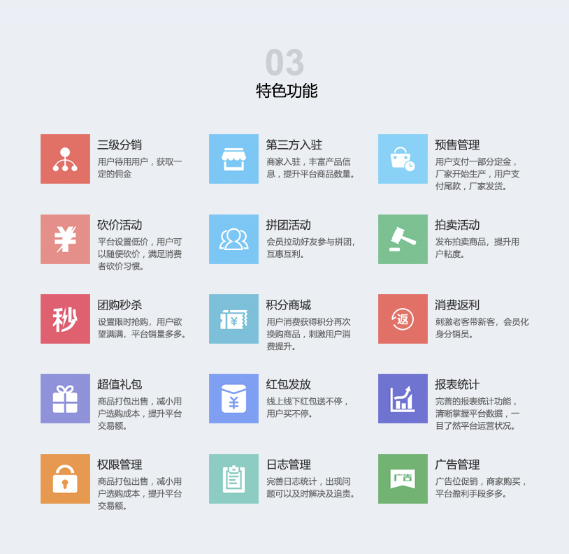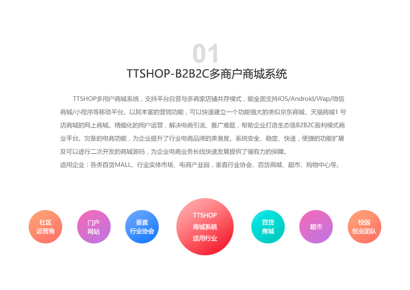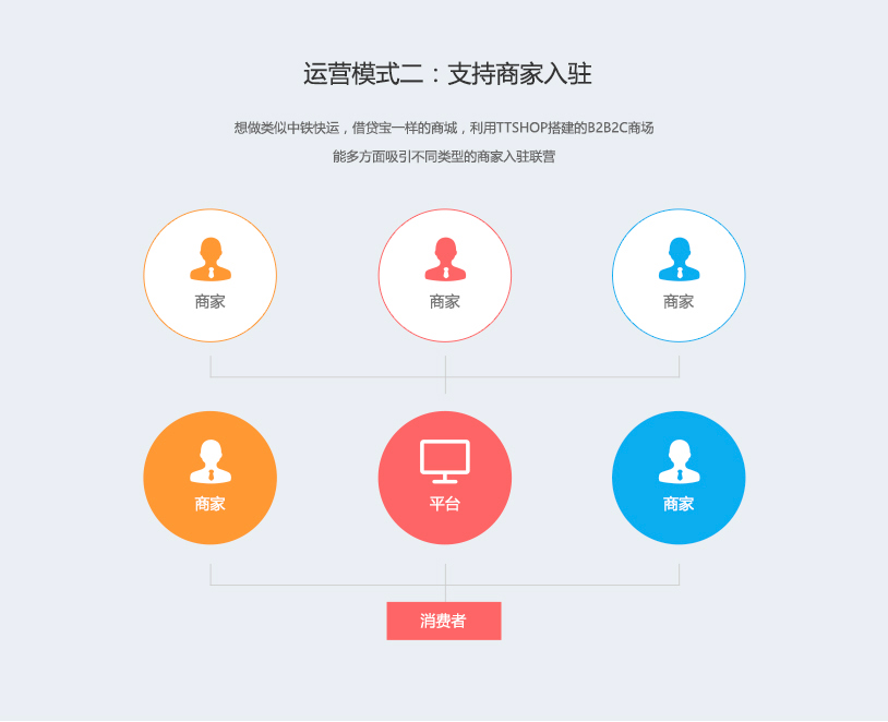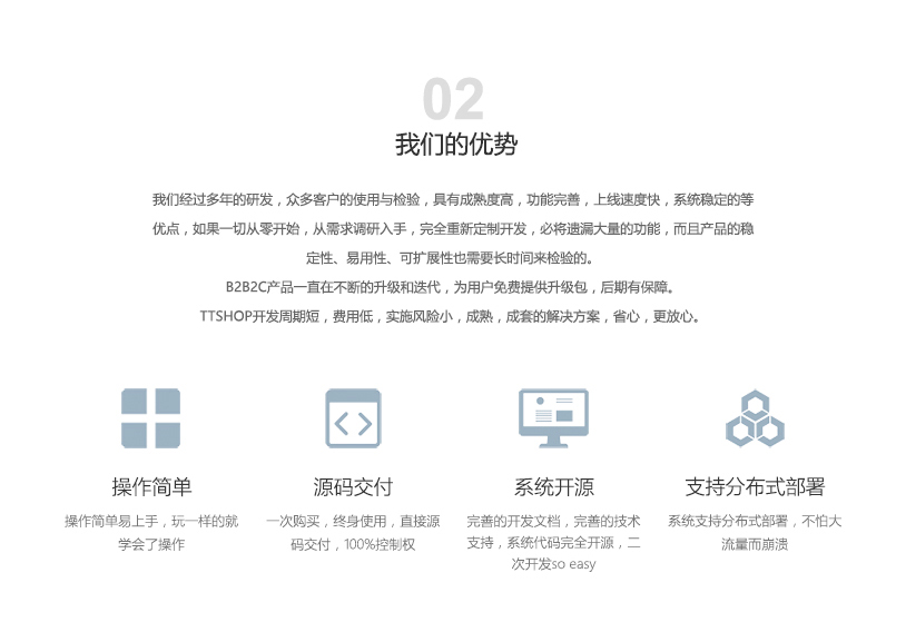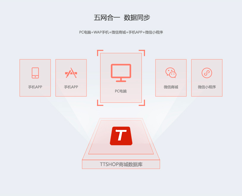 依托阿里云平台,开发的商城系统,网站后台同时管理PC商城,手机商城,微信商城,分销。系统具有个性化的“B2B2C+网点”电商模式商城系统,注重用户的极致体验,为用户提供简单流畅的购物体验。TTSHOP系统在开发过程中完全按照大型网站进行架构,可支持上亿级数据,如负载均衡,高效缓存服务器,Memcache 及 Web 群组,数据库集群,单站搜索引擎服务等。