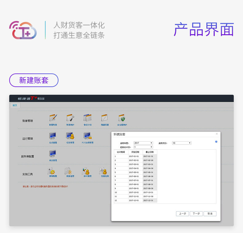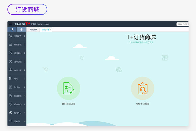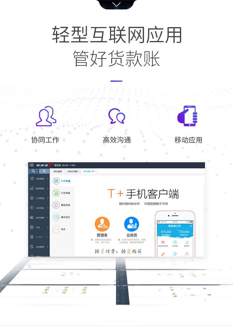 4 财务、进销存、协同办公、移动管理套餐:标准总账、标准T-UFO、标准购销管理、标准库存核算、工作圈OA(30用户x12月)、T+移动销售(仅支持3用户,1用户x12月)、T+移动管理(仅支持1用户,1用户x12月)