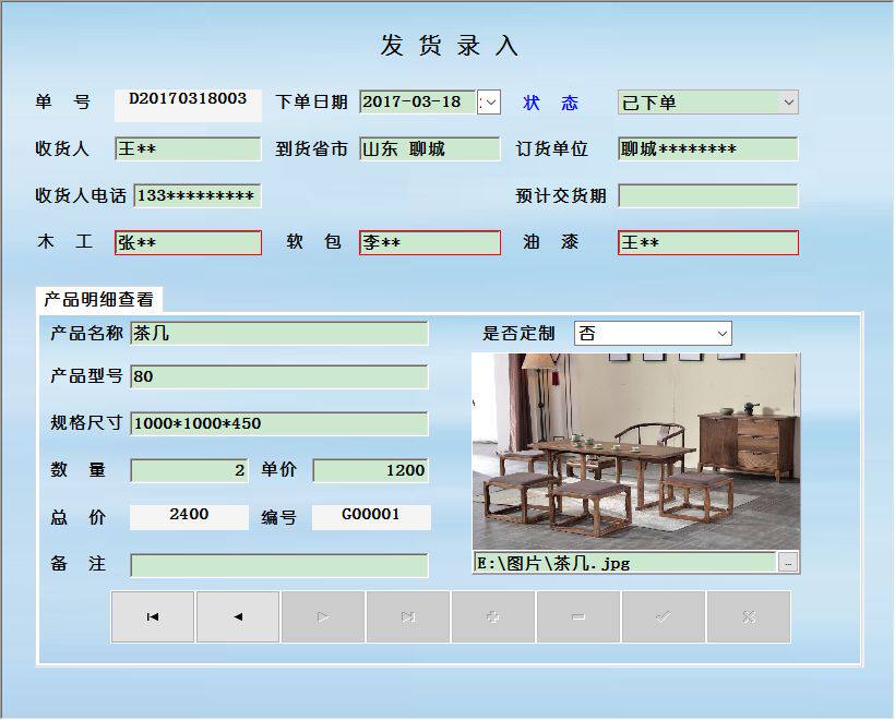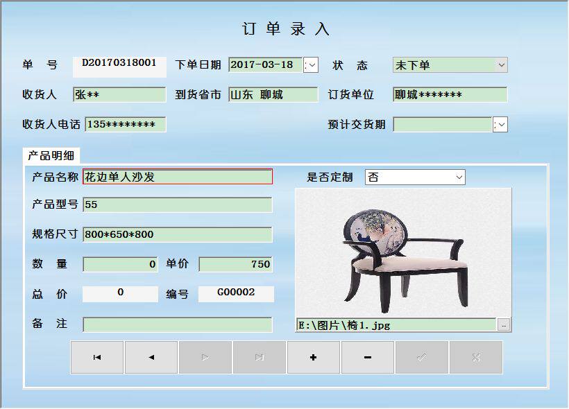 《家具厂订单管理系统》是为了家具厂方便管理订单而制作的一款软件,软件包括基本信息:新增商品、员工信息、类别设置和商品列表;订单管理:订单录入、发货录入、订单列表;订单查询:订户单位查询、订货日期查询、收货人查询、到货地址查询、木工查询、油漆查询和软包查询。家具图片采用图片路径的方式,在软件中保存图片路径,但能在软件中随时可以查看家具图片,此图片文件是保存在电脑硬盘上,保证图片存在,如果被删,在软件中不会显示。
