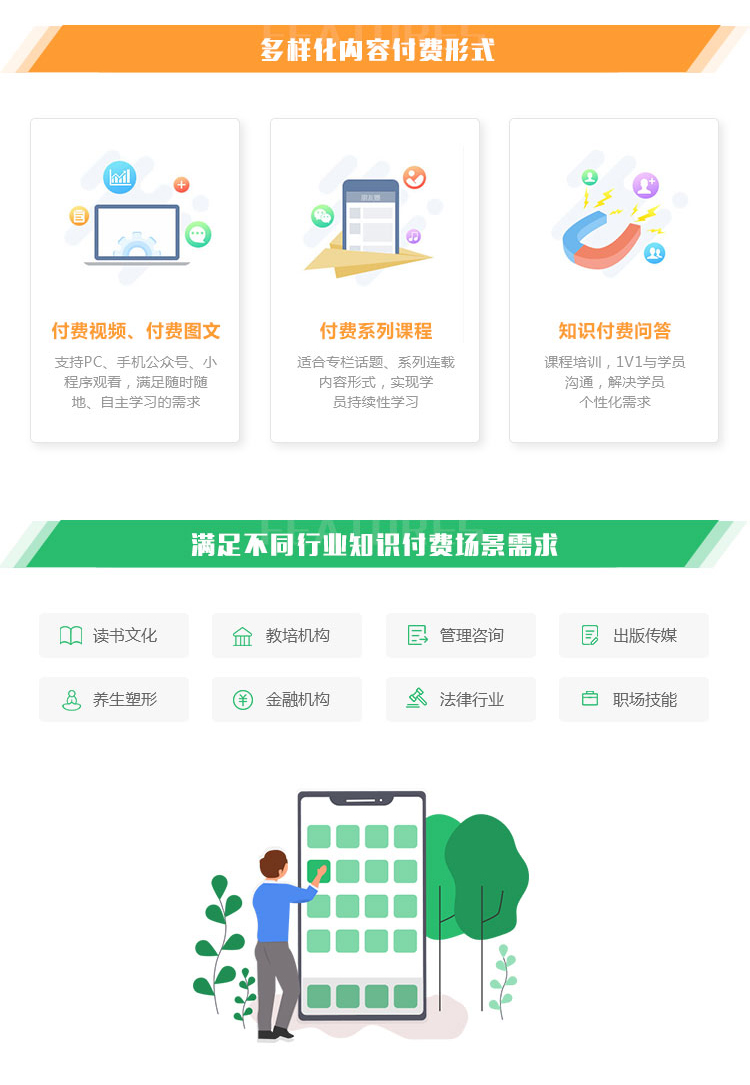 知识付费商城、书籍阅读小程序、在线培训平台、课程视频图书系统,帮助各领域达人、自媒体提供一站式内容变现的解决方案展开