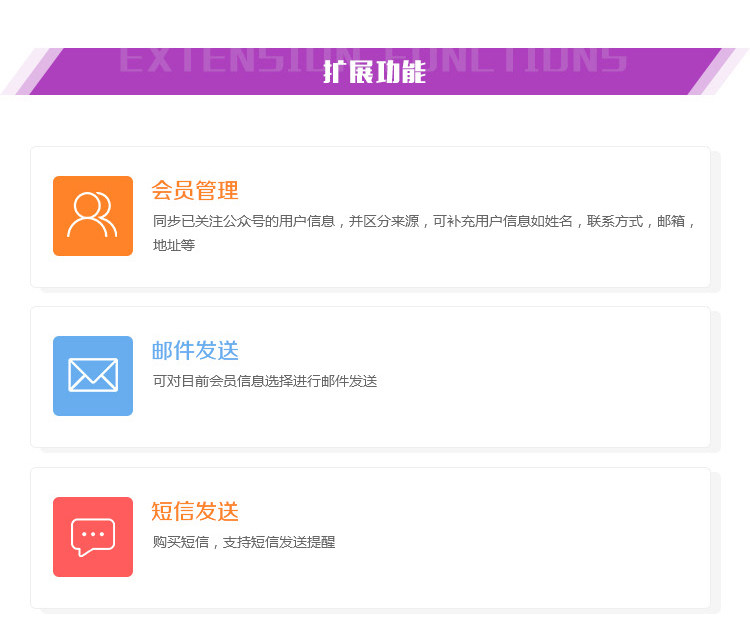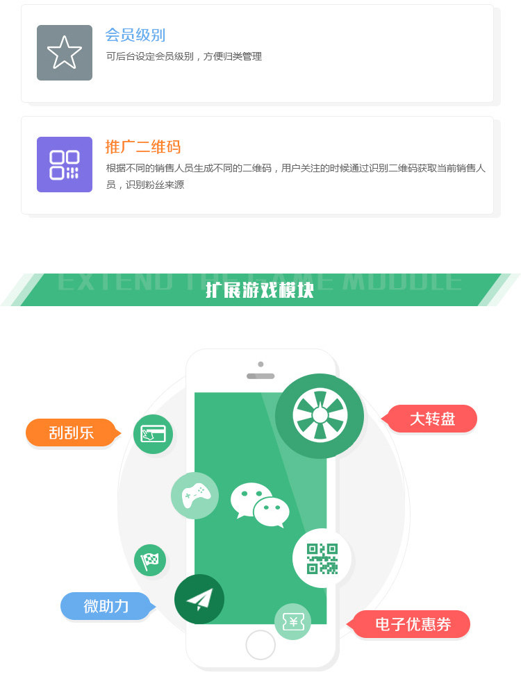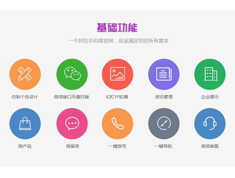 定制设计,微信接口无缝对接,幻灯片轮播,微产品,资讯管理,微留言,一键拨号,会员管理,电子优惠券,互动营销模块等。
