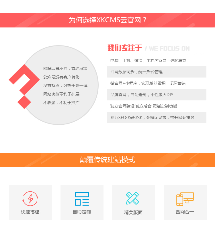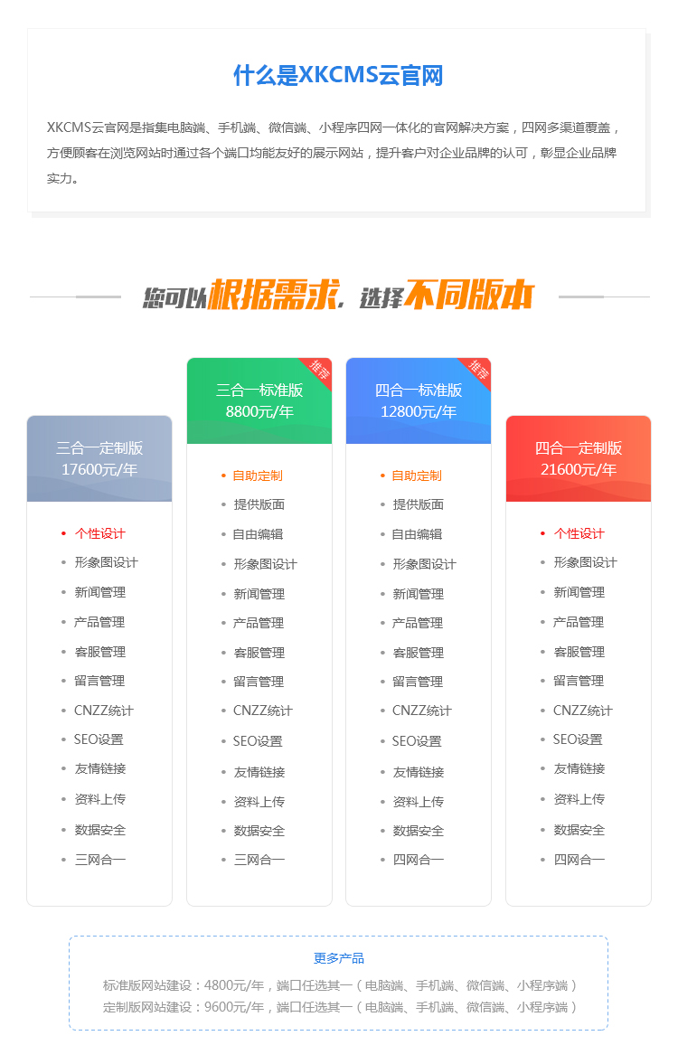 XKCMS云官网是指集电脑端、手机端、微信端、小程序四网一体化的官网解决方案,四网覆盖,提升客户对企业品牌的认可,彰显企业品牌实力。展开