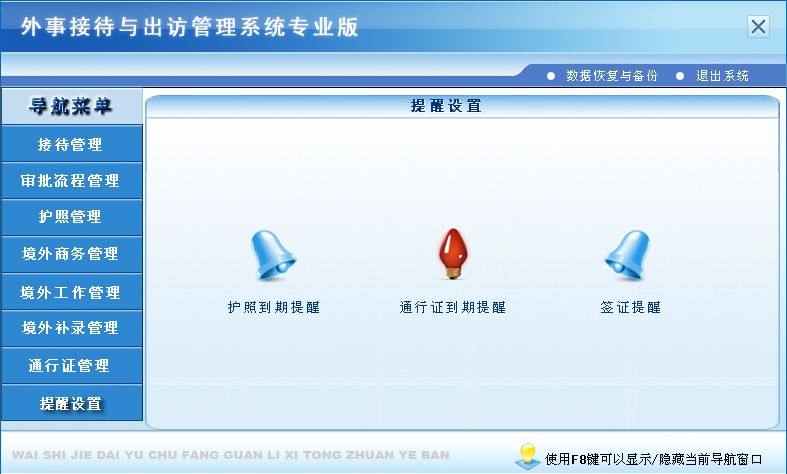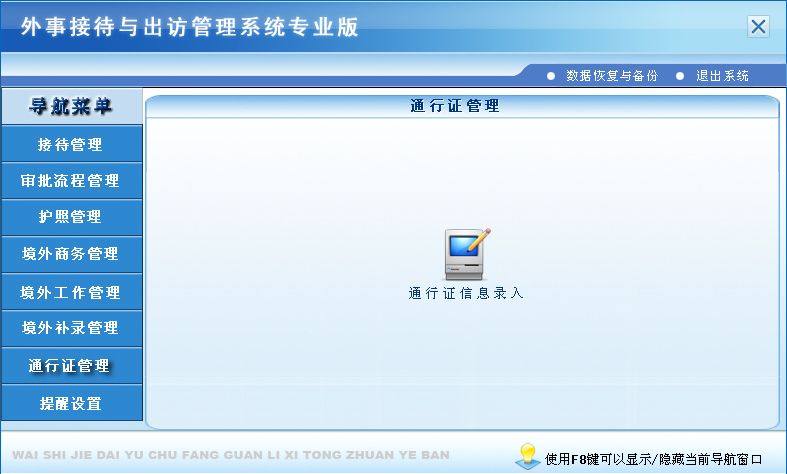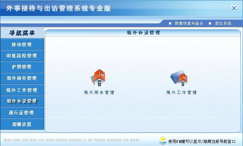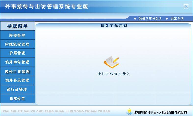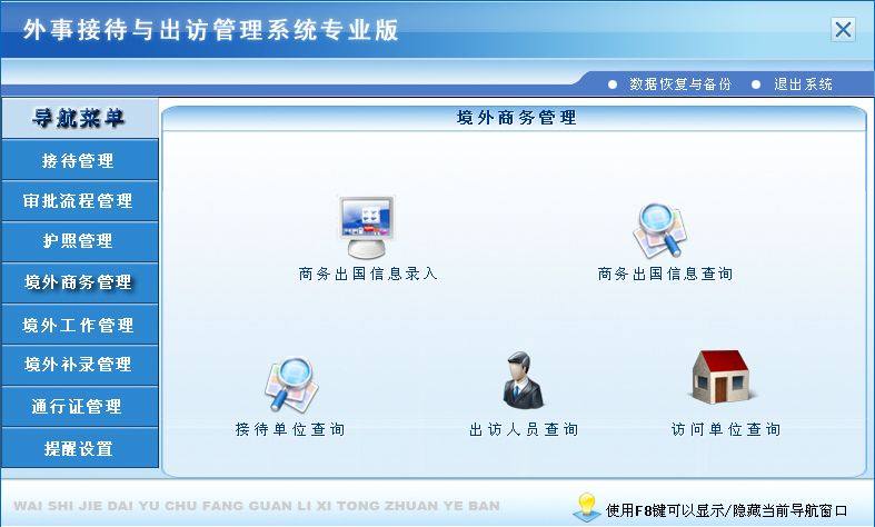 《外事接待与出访管理系统专业版》是本国与世界各国的对外交往活动和出访情况进行记录和查询的管理系统,该系统适合各个外事单位应用,用户可自行开发设计新的管理应用,十分方便。 在功能上,它主要包括了“接待管理”、“审批流程管理”、“护照管理”、“境外商务管理”、“境外补录管理”、“通行证管理”、“文件管理”、“提醒设置”。其中接待管理包括(接待与来宾信息录入、来宾情况查询、接待情况查询、接待人员汇总、接待类别汇总);审批流程管理包括(审批流程信息录入、审批流程信息查询、批次护照信息录入);护照管理包括(护照信息录入、护照信息查询);境外商务管理包括(商务出国信息录入、商务出国信息查询、接待单位查询、出访人员查询、访问单位查询);境外工作管理包括(境外工作信息录入);境外补录管理包括(境外商务管理、境外工作管理);通行证管理包括(通行证信息录入);提醒设置包括(护照到期提醒、通行证到期提醒、签证提醒); 在操作上,它集输入、维护、统计和各种处理为一体,信息导入导出方便共享,灵活、专业的报表设计。查询、筛选、 增强的数据处理,完美的信息图形分析,用户可根据实际需要自行开发这些功能! 系统无代码开发,易学易会,功能强大,操作简单,实用方便。