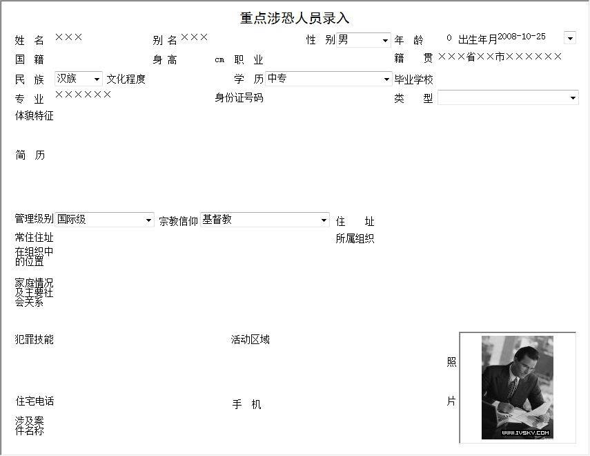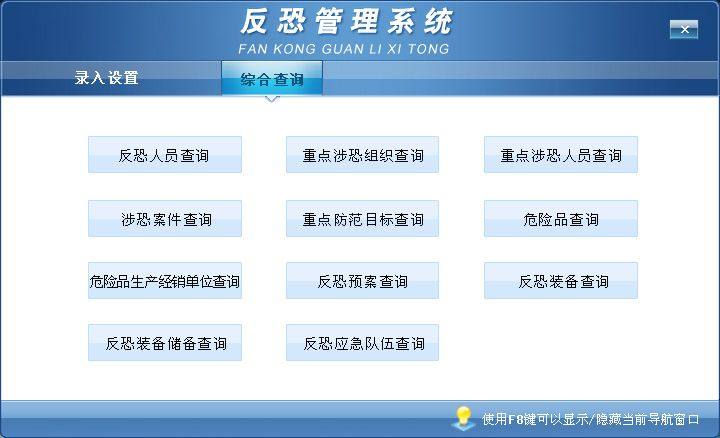 《反恐管理系统》是一款为反恐管理人员提供快捷方便服务的软件,本软件集数据查询、统计为一体。 主要包括: 1、反恐人员:反恐人员录入、反恐人员查询 2、重点涉恐组织:重点涉恐组织录入(注意:系统自动生成组织编号,用户也可以手动输入,输入时应注意组织编号的唯一性且不为空的特点;组织名称不能为空,否则系统将出现"组织名称不能为空"提示。)、重点涉恐组织查询3、重点涉恐人员:重点涉恐人员录入、重点涉恐人员查询 4、涉恐案件:涉恐案件录入(注意:系统自动生成案件编号,用户也可以手工输入,输入时应注意案件编号的唯一性且不为空的特点;这里的案件名称不能为空,否则系统将出现"组织名称不能为空"提示。)、涉恐案件查询 5、重点防范目标:重点防范目标录入、重点防范目标查询 6、危险品:危险品录入、危险品查询 7、危险品生产经销单位:危险品生产经销单位录入、危险品生产经销单位查询 8、反恐预案:反恐预案录入、反恐预案查询 9、反恐装备:反恐装备录入、反恐装备查询 10、反恐装备储备:反恐装备储备录入、反恐装备储备查询 11、反恐应急队伍:反恐应急队伍录入、反恐应急队伍查询