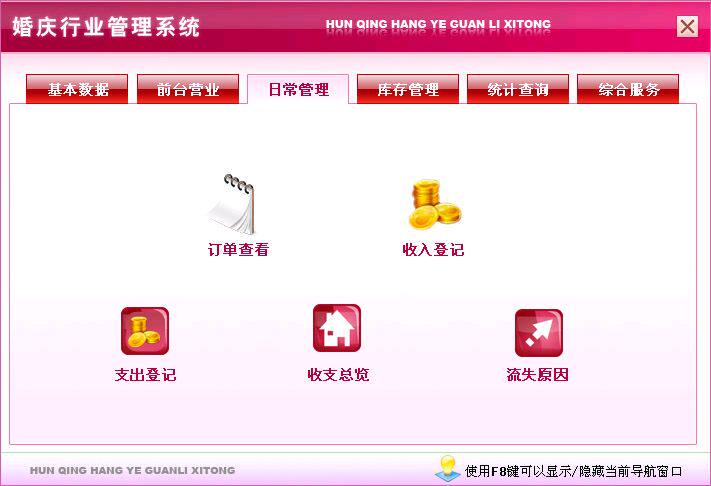《婚庆行业管理系统》是一款为婚庆、礼仪服务行业量身定做的管理软件。主要包括:前台营业、资料图 片展示、订单管理及未签单跟踪、收支管理、库存管理、结婚纪念日提醒及回访记录、客户调查、统计查 询、基本资料设置和综合服务等功能模块,实现了对婚庆服务完善的流程控制,节省费用和时间,提高客 户满意度。